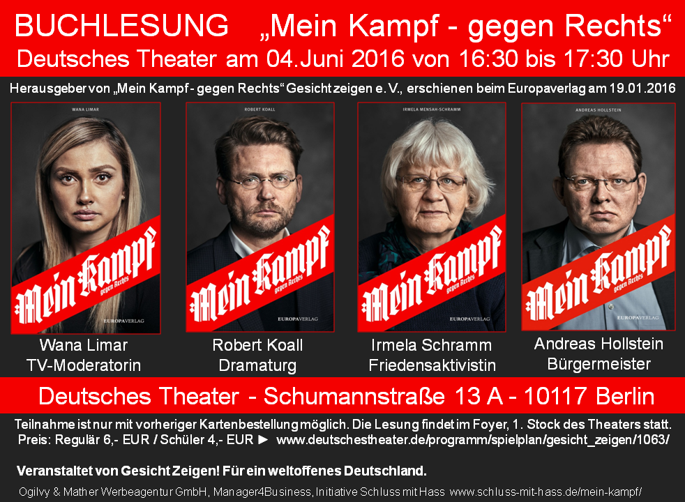 Buchvorstellung, Lesung und Diskussion mit: Uwe-Karsten Heye, Vorsitzender des Vereins „Gesicht Zeigen!”, Herausgeber des Buchs; Iris Berben, Schauspielerin, Unterstützerin des Projekts; Robert Koall, Chefdramaturg Staatsschauspiel Dresden, Autor und Protagonist des Buchs; Andreas Hollstein, Bürgermeister von Altena/Westfalen, Protagonist des Buchs; Wana Limar, Moderatorin von „MTV Style”, Protagonistin des Buchs; Moderation: Lutz Meier, Journalist und Koordinator/Redakteur des Buchs