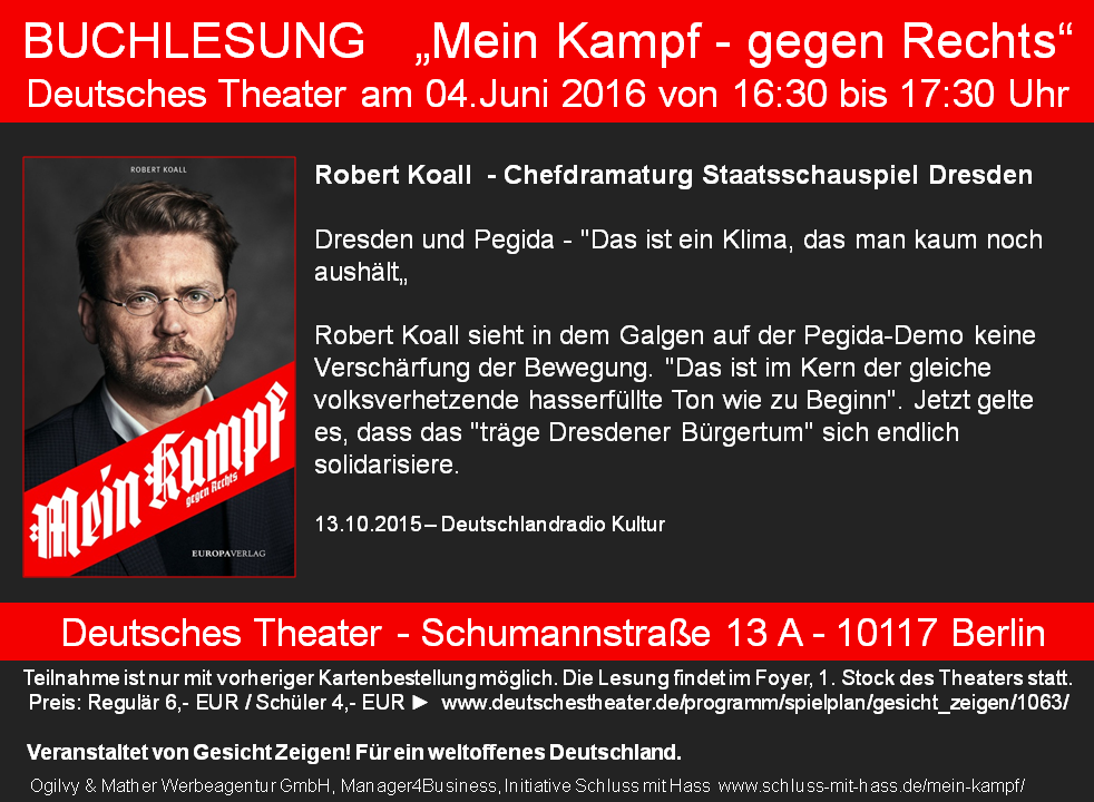 16:30 Uhr - Begrüßung durch Lutz Meier, Moderator der Veranstaltung, Begrüßung und kurze Vorstellung des Projekts durch Herrn Heye (Gesicht Zeigen!), Uwe-Karsten Heye liest „Andreas Hollstein – Das Kleine kannst du beeinflussen“ vor, Wana Limar liest „Vom Flüchtlingskind zum MTV-Gesicht – könnte sich nach einer Traumstory anhören“, Alexander Khuon liest „Robert Koall – Ein Jahr mit Pegida“ vor (Robert Koall ist Chefdramaturk des Dresdener Staatsschauspielhaus, welches im Anschluss „Graf Öderland / Wir sind das Volk am Deutschen Theater Berlin aufführt).