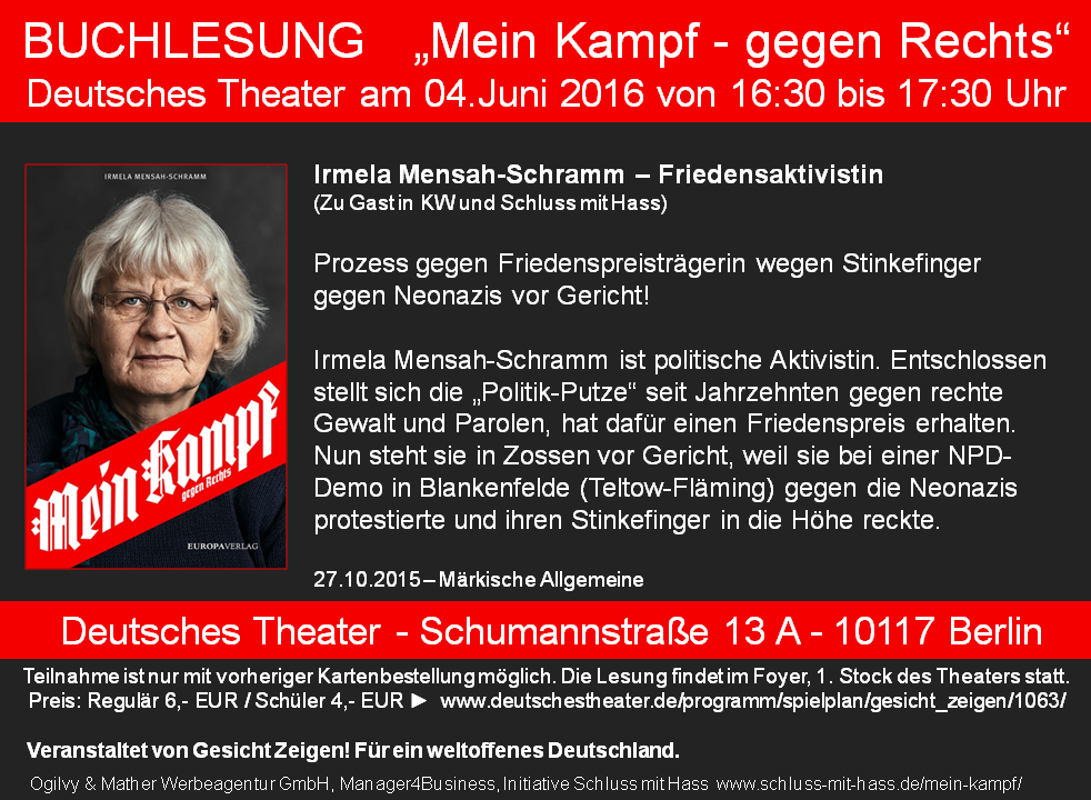 In dem Buch „Mein Kampf - gegen Rechts“ – Herausgeber Gesicht Zeigen - für ein weltoffenes Deutschland e.V. - erschienen am 19. Februar 2016 beim EUROPA VERLAG, beschreibt Irmela Mensa-Schramm ihren persönlichen Kampf gegen fremdenfeindliches Gedankengut und Gewalt.