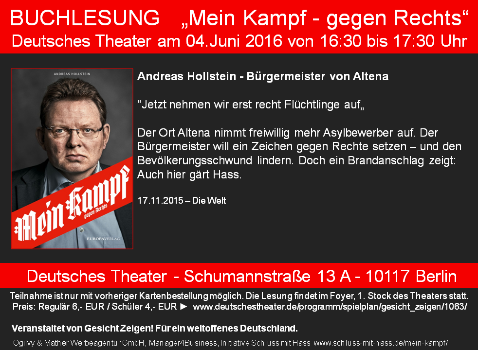 Daher war ich hocherfreut über eine Anfrage der Agentur Ogilvy, die Journalisten suchte für das Buchprojekt „Mein Kampf - gegen Rechts". Damit haben Ogilvy und der Verein Gesicht Zeigen! ein energisches Zeichen gegen Rechts gesetzt. Elf Menschen beschreiben darin ihren persönlichen Kampf gegen fremdenfeindliches Gedankengut und Gewalt: Es berichten unter anderem der Auschwitz-Überlebende Mosche Dagan, die Hamburger Flüchtlingshelferin Emma Louise Meyer, die mit einem Hilfe-Apell via You-Tube bekannt geworden ist und Wana Limar, die als afghanisches Flüchtlingskind in Deutschland aufwuchs und MTV-Videostar wurde. Ich hoffe, dass die Menschen in „Mein Kampf - gegen Rechts“ die Leserinnen und Leser dazu inspirieren, selbst weltoffen zu fühlen, zu denken und zu handeln. Das Buch zeigt: Die Möglichkeiten, den Kampf gegen Fremdenfeindlichkeit aufzunehmen, sind vielfältig.